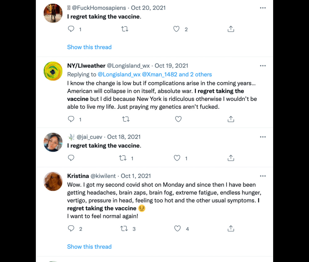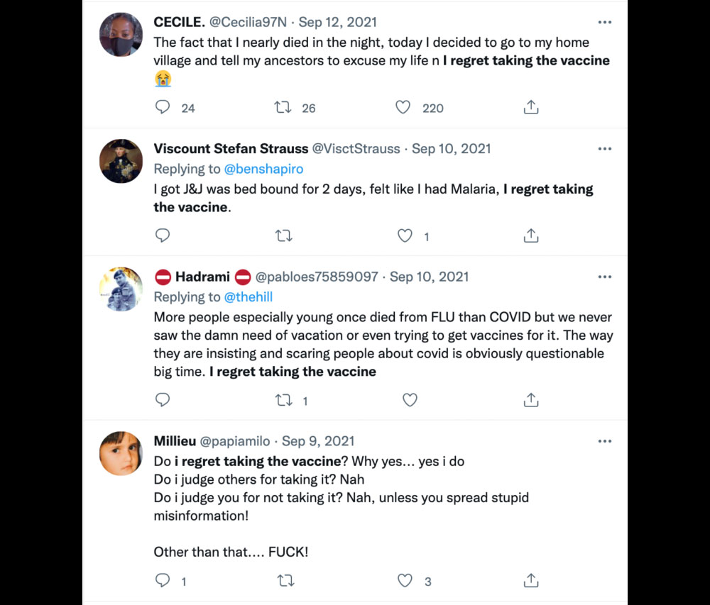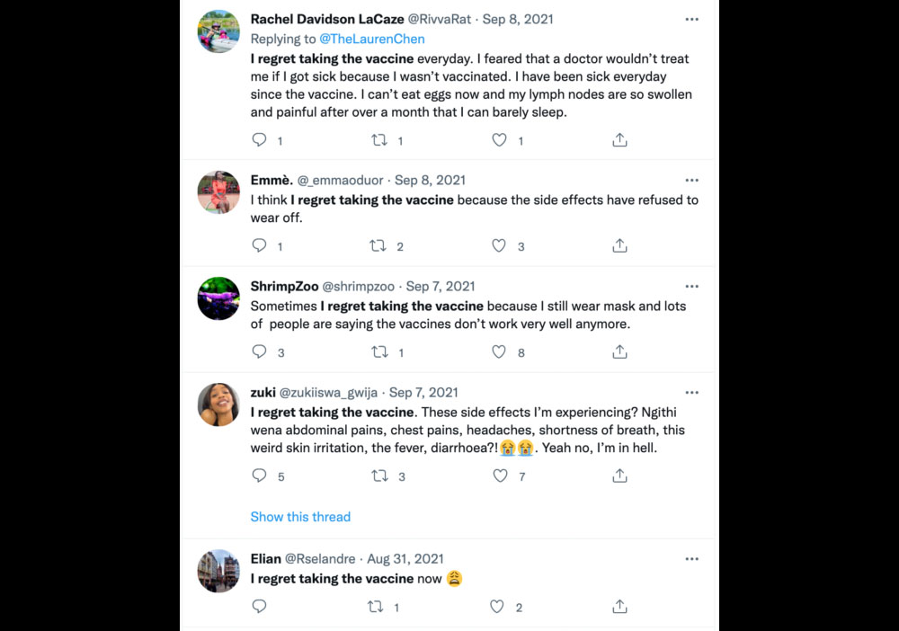 自去年7月起,推特上面開始陸陸續續出現許多後悔接種疫苗的言論,有人對自己接種過新型冠狀病毒疫苗感到遺憾,表示絕對不會接受第二劑,亦有人控訴指「我每天都在後悔接種疫苗,因為副作用一直沒有消失。」
