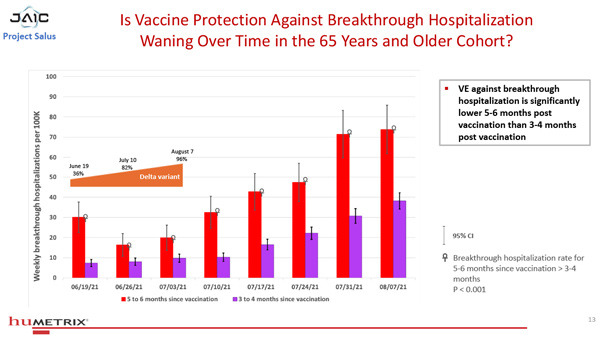 「自信使核糖核酸疫苗接種以來,突破性住院的風險隨著時間的推移而增加,接種後6個月的優勢比增加到
