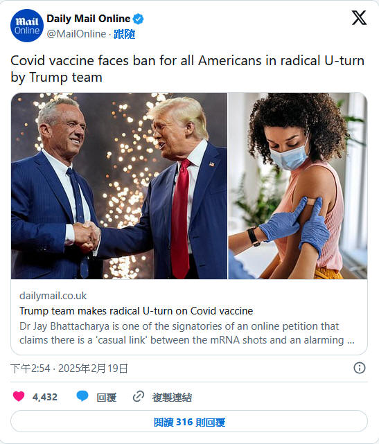 https://modernity.news/2025/02/19/report-trump-could-be-about-to-ban-covid-vaccines/ 據報道,特朗普衛生官員可能即將建議美國所有年齡層的人完全停止接種新冠疫苗。