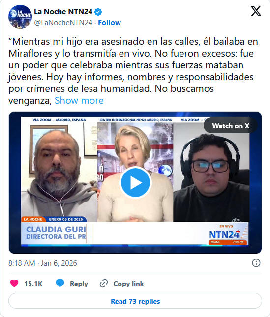 NTN24電視台也採訪了以色列·卡尼薩萊斯,他的兒子阿曼多·卡尼薩萊斯是一位18歲的音樂家,於2017年5月在加拉加斯參加反對社會主義政權的抗議活動時遇害。目前居住在西班牙的卡尼薩萊斯回憶說,馬杜羅經常出現在舞台上跳舞,而同時,政權官員卻在國內殘酷鎮壓和殺害抗議者。