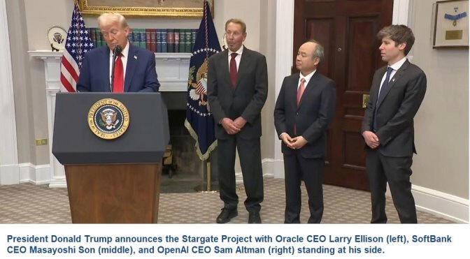 2025年1月21日,特朗普上任後的第一個完整工作日,總統與薩姆·奧特曼、甲骨文首席執行官拉里·埃里森和軟銀首席執行官孫正義站在一起,宣布了《星際之門計劃》,特朗普稱其為「有史以來遠遠最龐大的人工智慧基礎設施項目」。這三位男士共同承諾將向該項目投資5000億美元,這促使特朗普說:「但對我來說,這是一件非常重要的事情——5000億美元的星際之門計劃。我認為這將會是非常特別的事情。它將會引發可能是所有事物中最龐大的事情。」(9)