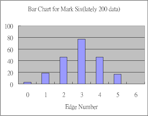 我們製作了長條圖(圖2),以邊緣數(水平軸)核對香港最近二百期六合彩結果(從2005年12月24日到2004年9月16日)。 山形的長條圖顯示多數中獎號碼有三個邊緣數。中獎號碼的數量包括兩個或四個邊緣數比包括的三個邊緣數為低,再者中獎號碼的數量包括一個或五個邊緣數比包括兩個或四個邊緣數為低。中獎號碼並沒有全部皆是六個邊緣數,並且佔非常少數中奬號碼不包括任何邊緣數。 所有這些研究結果是完全符合我們的期望。