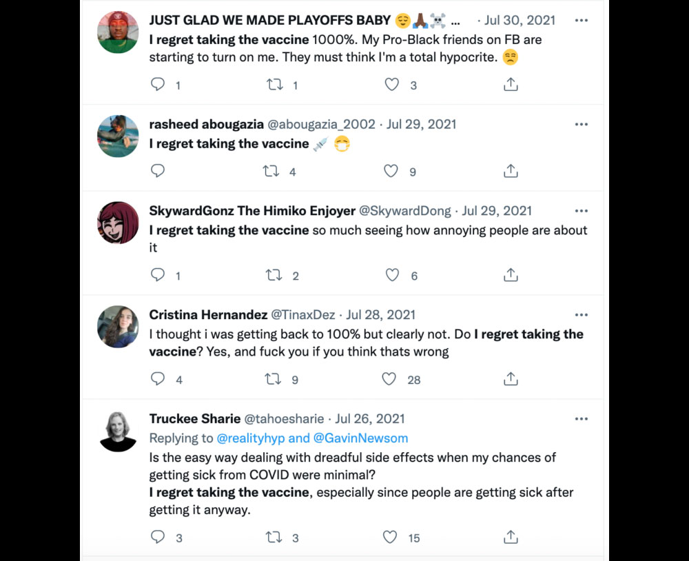 自去年7月起,推特上面開始陸陸續續出現許多後悔接種疫苗的言論,有人對自己接種過新型冠狀病毒疫苗感到遺憾,表示絕對不會接受第二劑,亦有人控訴指「我每天都在後悔接種疫苗,因為副作用一直沒有消失。」