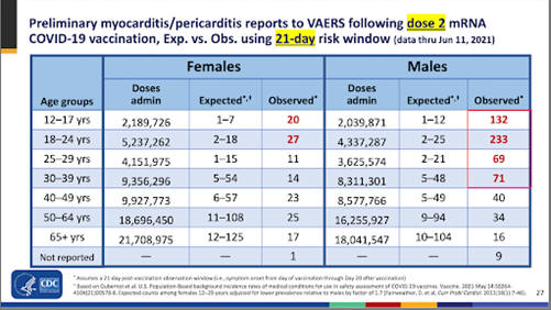疾病預防控制中心的免疫措施諮詢委員會(ACIP)在2021年6月23日召開的會議上提出了這一令人不安的信息(見下圖),該會議專門討論了接受輝瑞公司中共病毒疫苗的12至15歲兒童的心肌/心包炎風險。