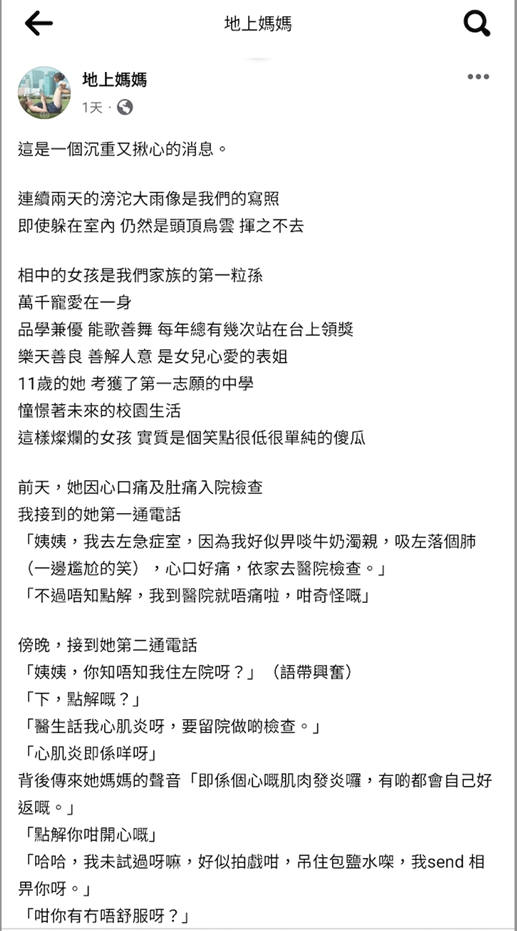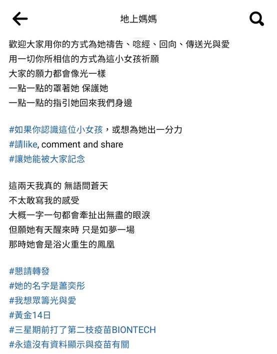 對於造成這一切的根本原因,奕彤阿姨在貼文中暗示,「奕彤三星期前曾接種第二劑復必泰疫苗……