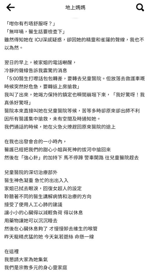 」,「原本『龍精虎猛』的奕彤,現在變得氣若遊絲、命懸一線……」 她最後呼籲網友,可用不同方式為奕彤禱告、唸經等,「眾籌」光與愛,更希望大家的願力會像光一樣,一點一點的指引她回來家人身邊。 |