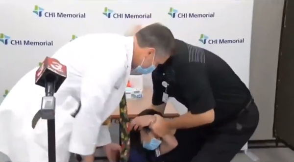 田納西州漢密爾頓縣查塔努加心臟研究所紀念醫院(CHI)的一名護士在自己直播接種疫苗時,在直播電視上公開吹噓冠狀病毒疫苗的安全性,然後在幾分鐘內失去知覺,幾乎站立不動在地板上,然後被其他醫生扶住並躺在地板上。