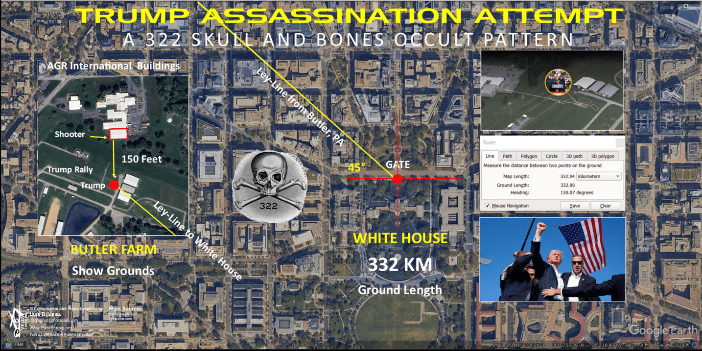 於是,在「看這裡」部門,一個想法浮現在腦海。有人想知道,「從賓夕法尼亞州巴特勒展覽場地的特朗普集會到白宮的距離有什麼聯繫?」根據谷歌地球,地面長度(以公里為單位)剛好是332公里。和?人們不禁會看到骷髏會的圖案和他們當時關於這次嘗試的322數位簽名。