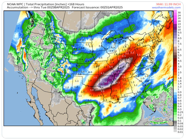 在美國中部的一些地區,五天內將迎來四個月的降雨。我們被告知,一條大氣河流將產生一條「水蒸氣消防水帶」,預計未來一周將向美國中心地帶傾瀉76萬億加侖的水。這是非常正常的,至少他們一直這麼告訴我們。