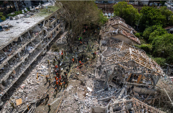 2025年6月22日,以色列安全和救援部隊抵達特拉維夫,伊朗發射的彈道導彈擊中該地並造成破壞。攝影:Chaim